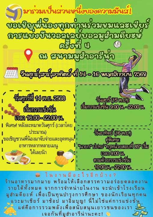 มาร่วมเป็นส่วนหนึ่งของความมันส์! ขอเชิญพี่น้องทุกท่านร่วมชมและเชียร์ การแข่งขันวอลเลย์บอลมูฮำมดียะห์ ครั้งที่ 4 ณ สนามมูฮำอารีน่า วันที่: ศุกร์-เสาร์-อาทิตย์ ที่ 14-15-16 พฤศจิกายน 2568 วันศุกร์...