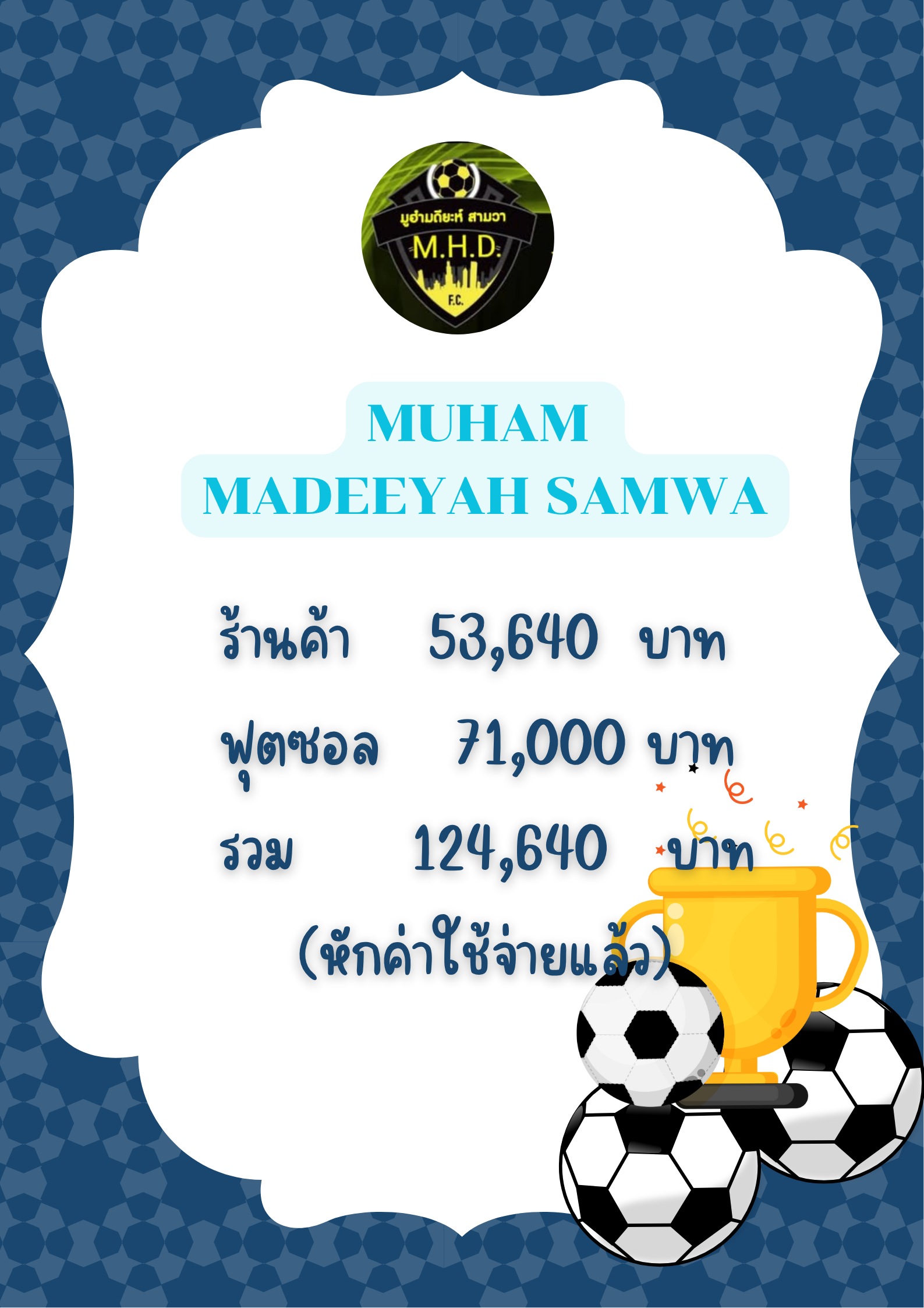 เรียนผู้สนับสนุนและผู้มีส่วนร่วมทุกท่าน โรงเรียนมูฮัมมาดียะฮ์ขอขอบคุณผู้มีอุปการคุณทุกท่านสำหรับการสนับสนุนกิจกรรมฟุตบอลการกุศล ที่จัดขึ้นเมื่อวันที่ 18-19 ตุลาคม 2568 ทางโครงการขอสรุปยอดรายได้ที่หักค่าใช้จ่ายแล้ว ดังนี้: 1. รายได้จากร้านค้า: 53,640 บาท 2. รายได้จากฟุตบอล: 71,000 บาท...